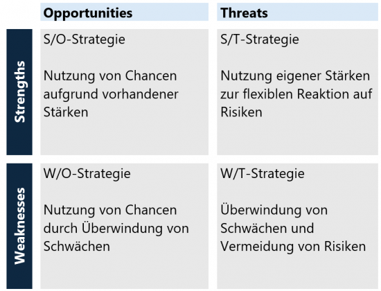 [[Datei:TOWS-Matrix .png|miniatur|550px|Abb. 3: TOWS-Matrix (In Anlehnung an Steven & Dümpelmann, 2020, S. 7)]] Die Gegenüberstellung von Stärken und Schwächen mit Chancen und Risiken wird als TOWS-Matrix bezeichnet. Sie dient der systematischen Entwicklung von Handlungsmöglichkeiten. Mithilfe der TOWS-Matrix wird die Wahrscheinlichkeit verringert, dass entscheidende Kombinationen unbeachtet bleiben (Dillerup & Stoi, 2022, S. 327 & 334).