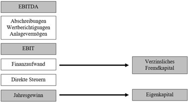 - EBIT (Earnings Before Interest and Taxes): Stellt den Gewinn vor Finanzaufwand (Zinsen) und Steuern dar (Lütolf, Rupp & Birrer, 2023, S. 213). Siehe dazu Abbildung 1.